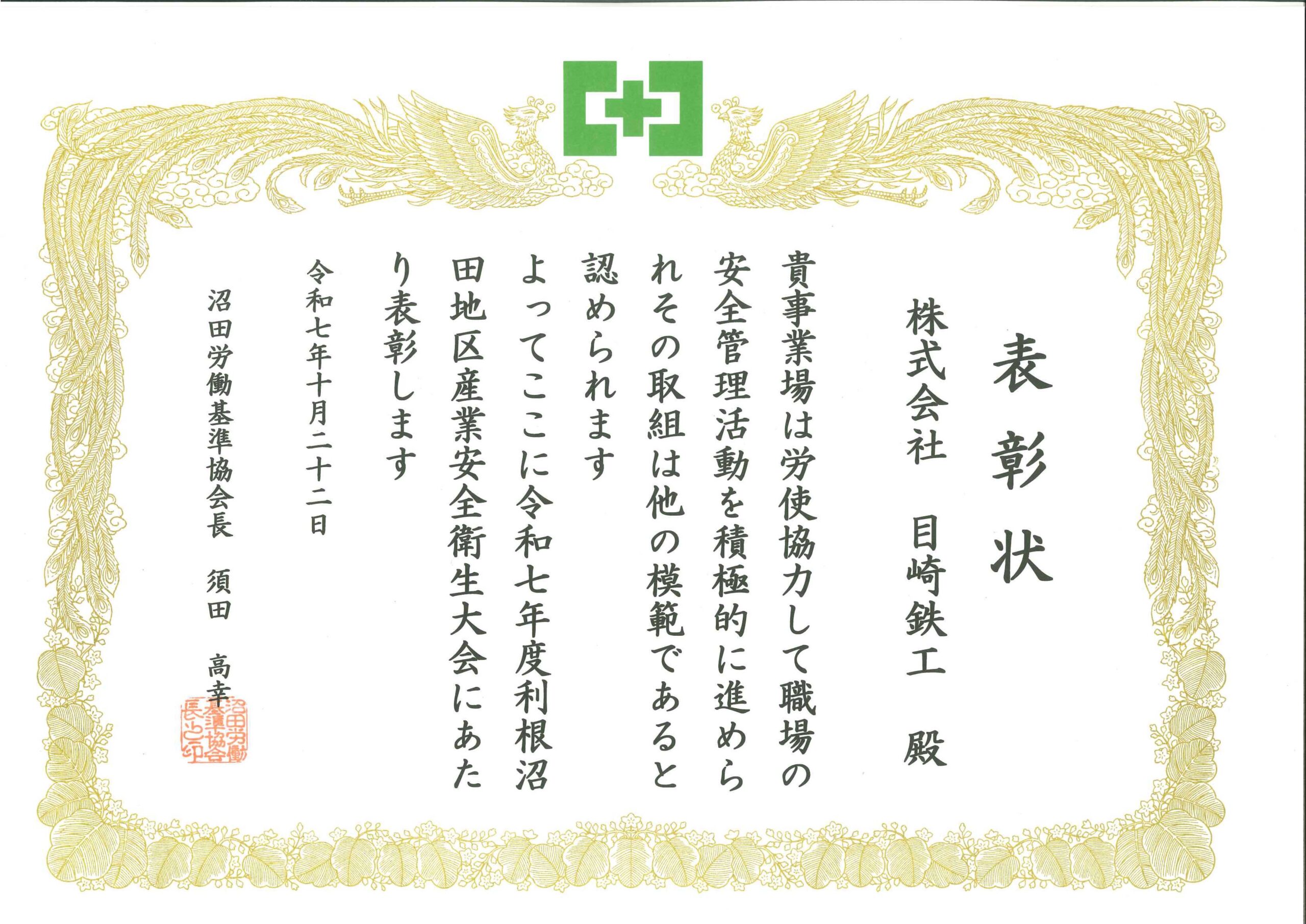 ◆沼田労働基準協会長表彰【産業安全部門】を受けました。