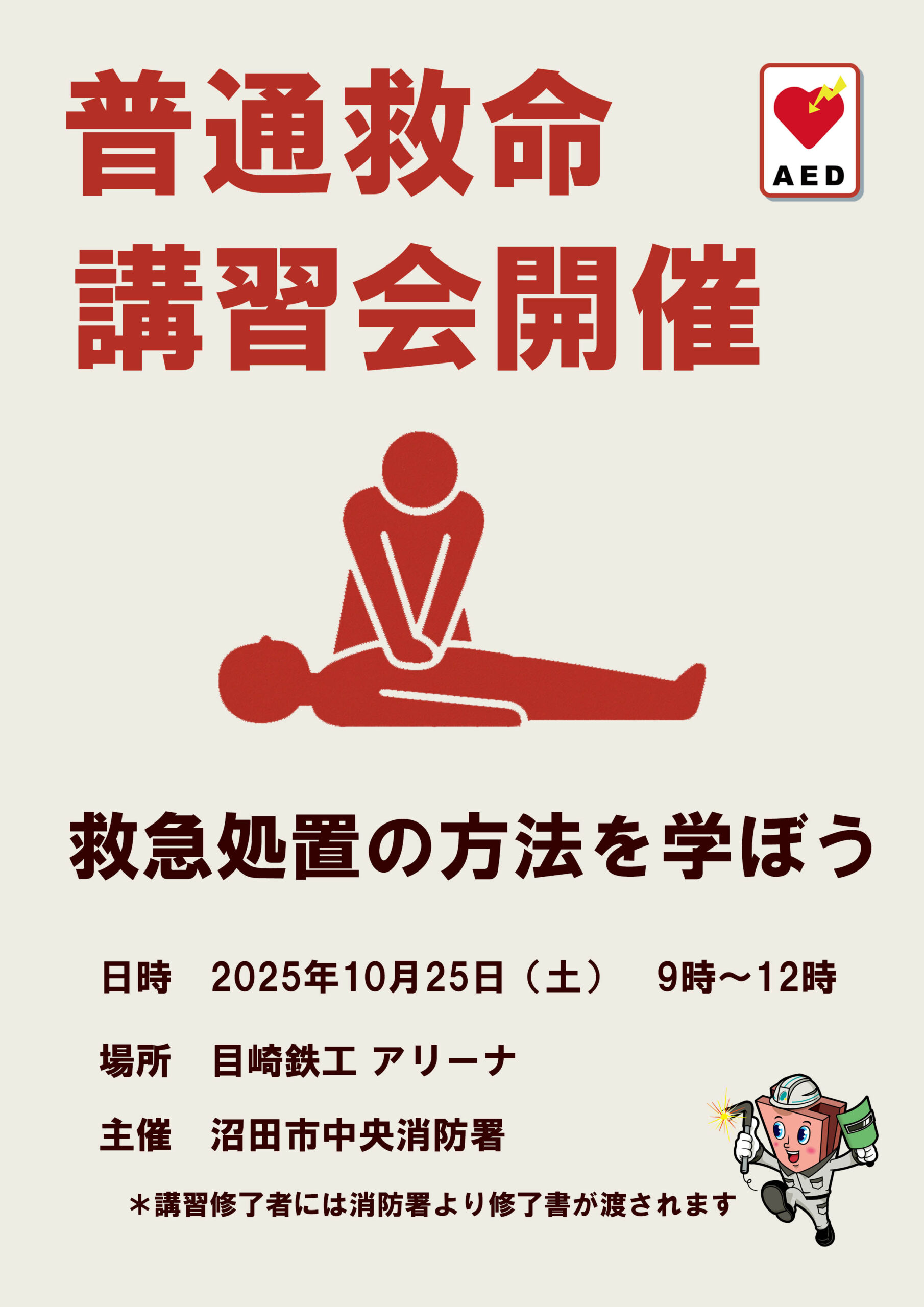 弊社アリーナにて普通救命講習会を開催いたしました。心臓マッサージやAEDの使用についても教えていただきまた火事・救急についての理解を深めました。沼田市中央消防署の職員のみなさまありがとうございました。