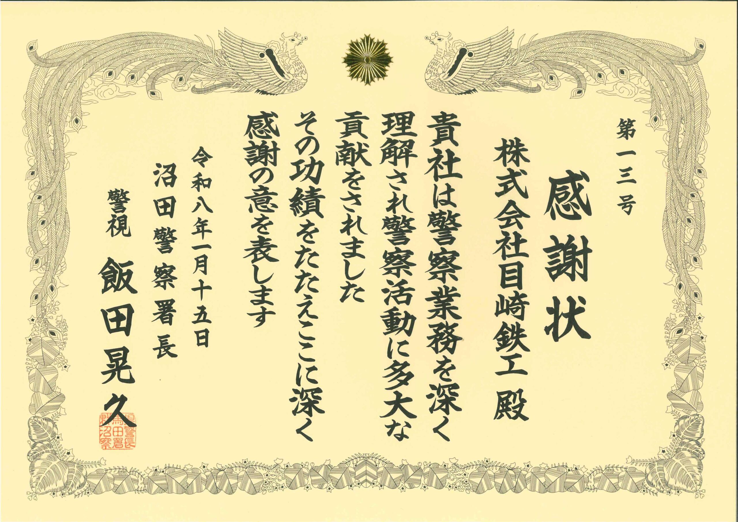 令和8年沼田警察署初点検に於いて目崎鉄工は表彰されました。